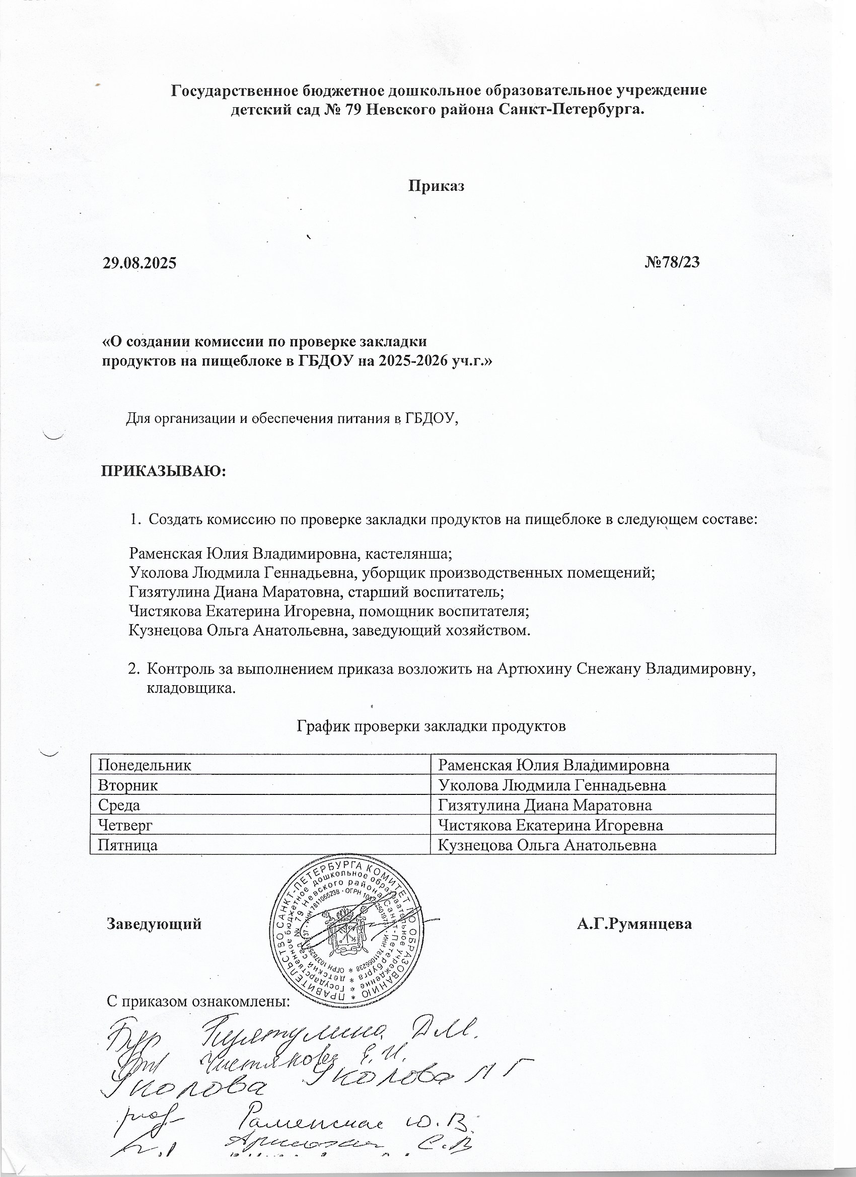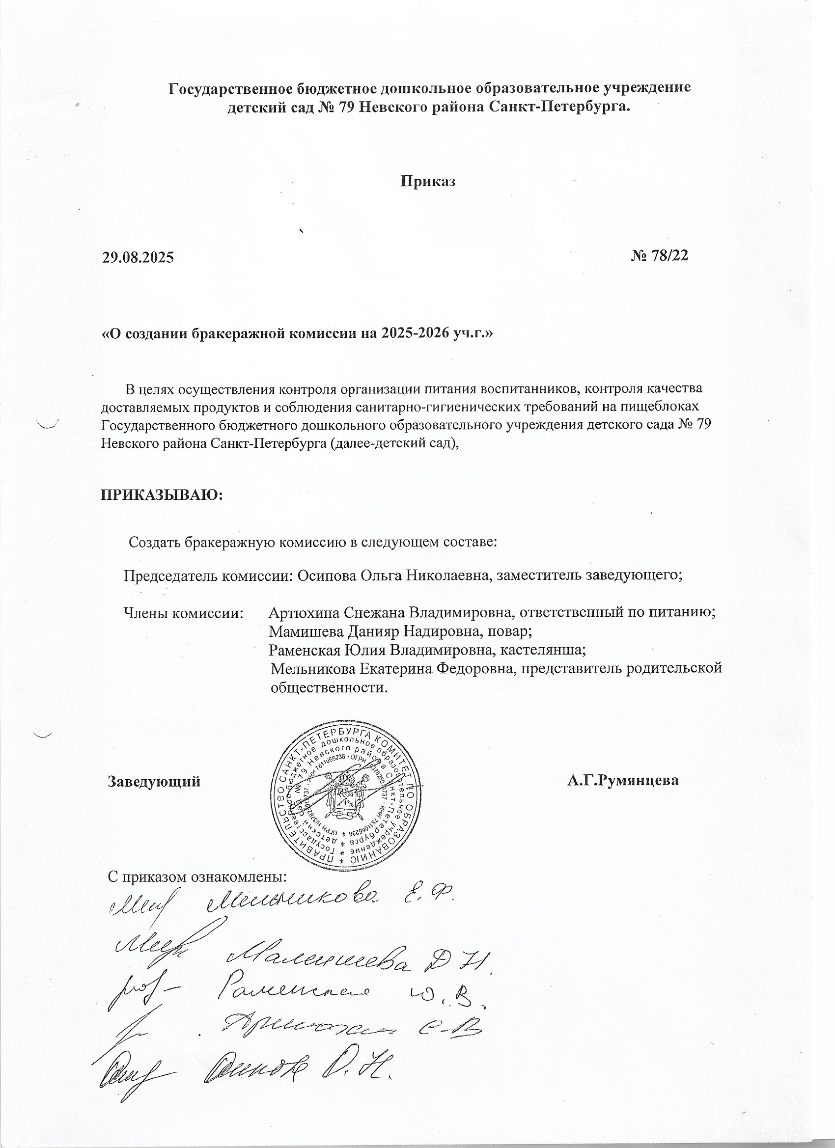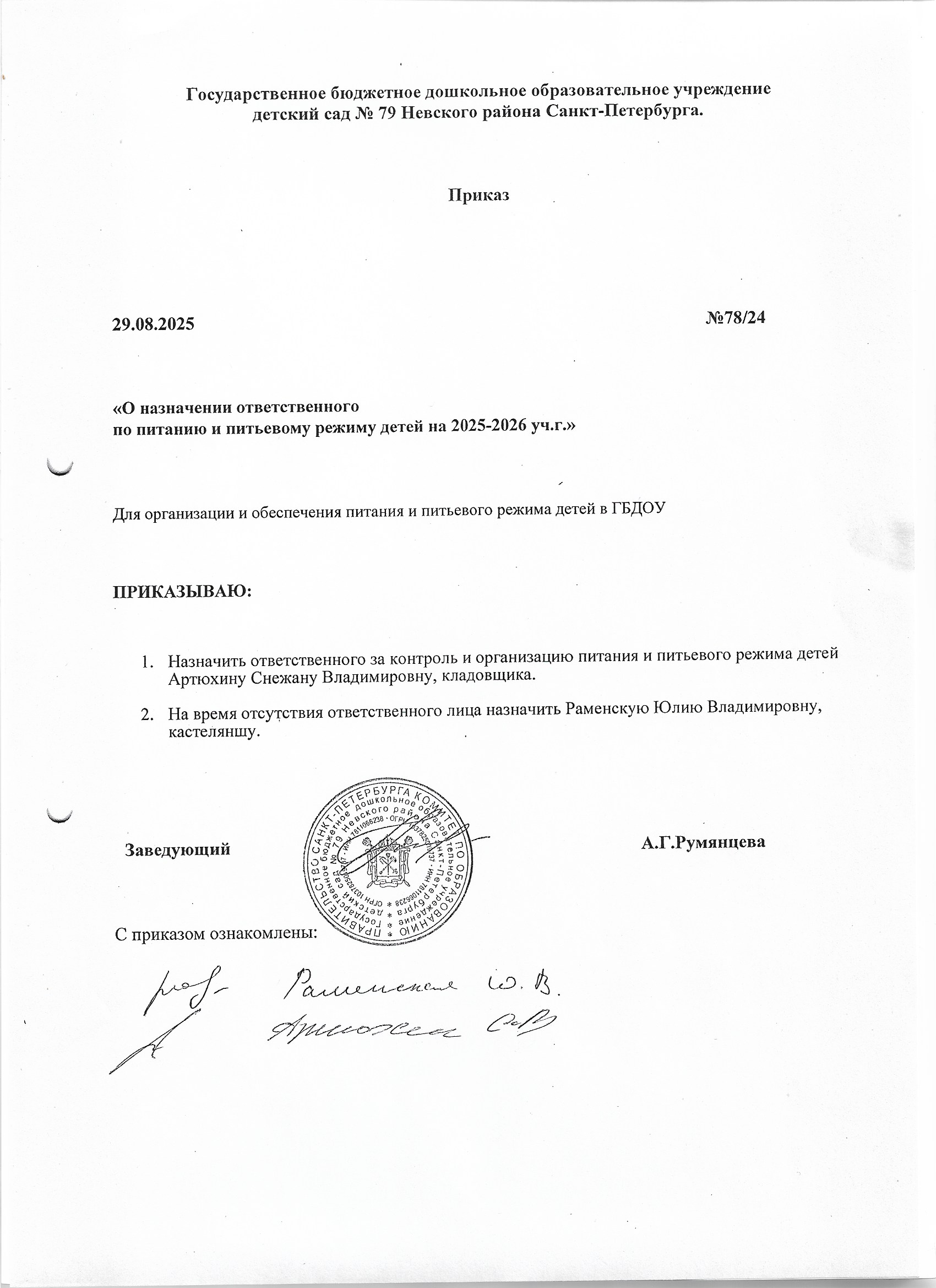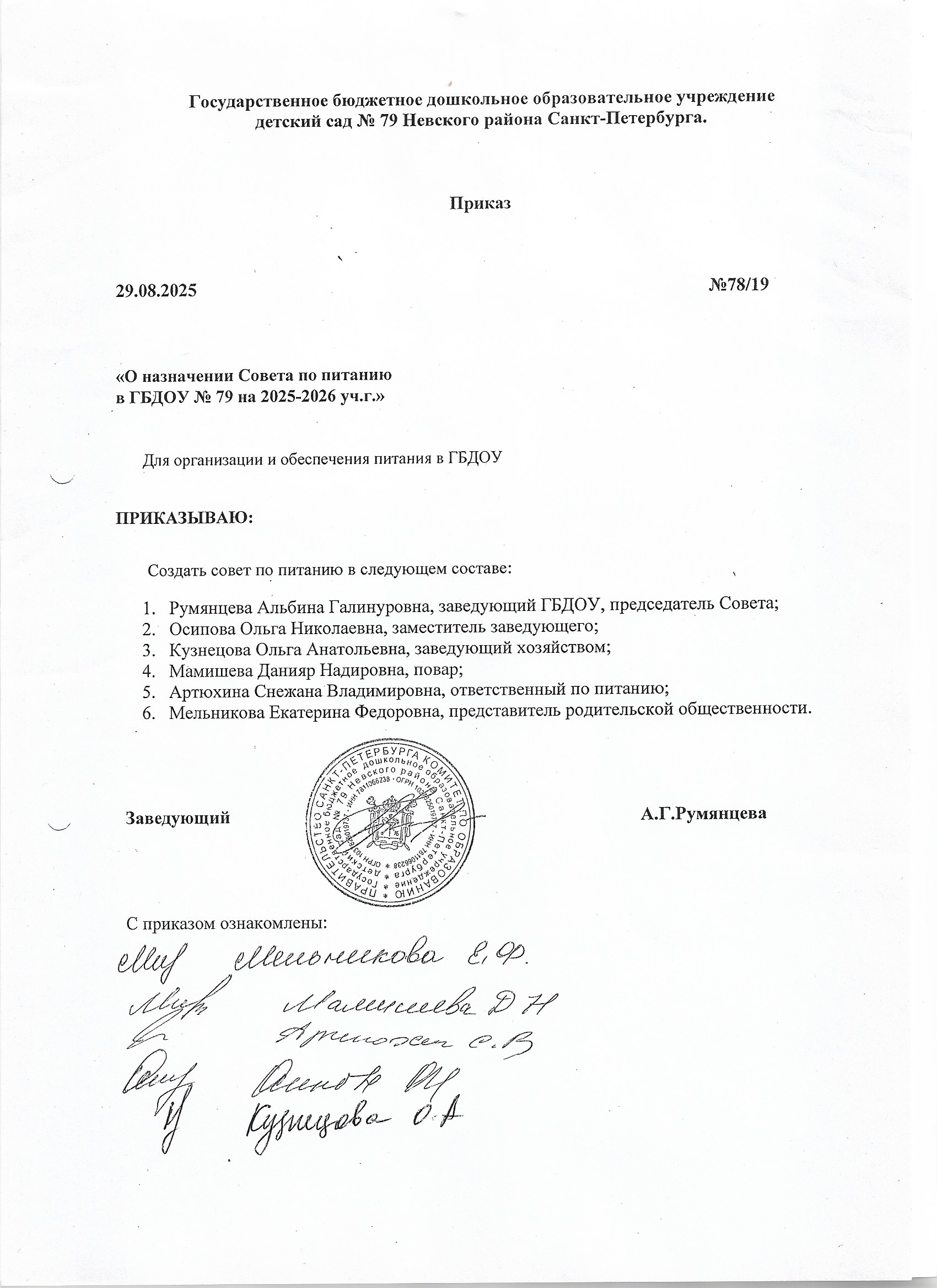 Приказ № 78/19 "О назначении Совета по питанию в ГБДОУ № 79 на 2025-2026 уч.г.."
